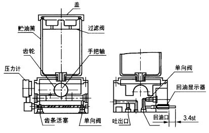 手動(dòng)潤(rùn)滑泵是借人工擺動(dòng)手把,通過齒輪帶動(dòng)齒條活塞往復(fù)運(yùn)動(dòng)實(shí)現(xiàn)向外供油的,當(dāng)活塞處于圖示極限位置時(shí),潤(rùn)滑脂通過吸入口吸入并充滿活塞的右腔,當(dāng)活塞向右移動(dòng)時(shí),被吸入的潤(rùn)滑脂在油壓的作用下頂開單向閥壓送至出口向外排出,當(dāng)系統(tǒng)中主分配器的一計(jì)量油口返回至回油指示器的油量達(dá)到3.2mL時(shí),指示桿全部伸出,證明系統(tǒng)所有潤(rùn)滑點(diǎn)已得到所需的潤(rùn)滑油量,此時(shí)停止操作手把并把指示桿向內(nèi)壓進(jìn),為下循環(huán)準(zhǔn)備,指示器內(nèi)的潤(rùn)滑脂經(jīng)單向閥返回貯油桶內(nèi)。