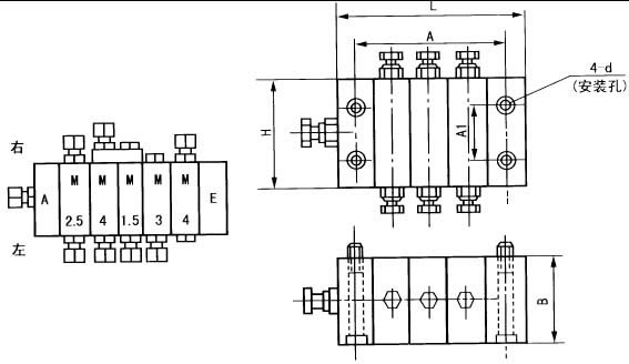 一、概述 JPQ(D)型遞進(jìn)分配器由首塊A,工作塊M、尾塊E 組成分配器組,工作塊的件數(shù)可根據(jù)需要選擇,最少三件,最多可達(dá)10 件,每件工作塊有兩個(gè)出油口,因此每一分配器組的出油口在6-20 個(gè)之間,也就是每一分配器組可供6-20 個(gè)潤滑點(diǎn),所需供油量的多少,可按型號規(guī)格表列數(shù)據(jù)選用。如果某潤滑點(diǎn)在一次循環(huán)供油中需要供油量較大或特大,可采用圖A3 的方法,取出工作塊內(nèi)部的封閉螺釘,并在出油口增加一個(gè)螺堵,使兩個(gè)出油口的油量合并到一個(gè)出油口。 注意所合并的供油量是工作塊排列中下一個(gè)工作塊型號所規(guī)定的供油量(參看工作原理圖)。如果合并兩個(gè)出油口的供油量仍然滿足不了需要,可采用圖A4 的方法,增加三通或二通橋式接頭,以匯集幾個(gè)出油口的油量來滿足需要。
