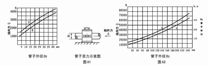 b)尺寸計算 H=H2+H3+(N-1)·T 式中:N ——管子根數(shù): T ——相鄰管距(見表3),mm; H2、H3見表2和表3 ◎注:組合安裝管夾的每組重量可近似按(N-0.5)乘以表2中的單件重量。 2.1 標(biāo)記說明 A 系列Ⅰ型、管子外徑為12mm的塑料管夾: 塑料管夾A(Ⅰ)12 JB/ZQ4008-97 B 系列Ⅱ型、管子外徑為28mm 的塑料管夾; 塑料管夾B(Ⅱ)28 JB/ZQ4008-97 B 系列Ⅰ型組合疊裝、管子外徑為22mm的3根、管子外徑為28mm的2根的塑料管夾; 塑料管夾B(Ⅰ)22×3-28×2JB/ZQ4008-97 三、管夾承載能力 (A1,A2 及圖A1,圖A2) A1 表示方法:管夾承受管子軸向力的能力大小,用曲線圖表示。 A2 具體內(nèi)容:圖A1 用于“A 系列管夾”;圖A2 用于“B 系列Ⅰ型管夾”。a 曲線表示管夾與管子處于“靜摩擦狀態(tài)”時,管子外徑尺寸與管夾承受管子軸向力的函數(shù)關(guān)系。b曲線表示管夾與管子處于“動摩擦狀態(tài)”時,管子外徑尺寸與管夾承受管子軸向力及轉(zhuǎn)矩的函數(shù)關(guān)系。