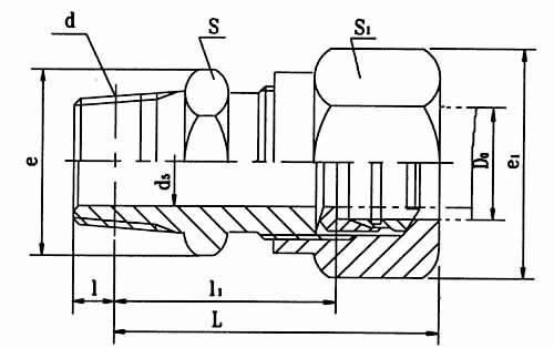 公稱壓力E級(jí),管子外徑D0為14mm的卡套式錐螺紋對(duì)接直通管接頭: