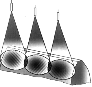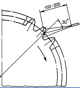 在對(duì)開(kāi)式齒輪進(jìn)行噴射潤(rùn)滑時(shí),應(yīng)把潤(rùn)滑劑噴射在驅(qū)動(dòng)小齒輪的受負(fù)荷的齒面上,這樣,當(dāng)驅(qū)動(dòng)小齒輪和大齒輪嚙合時(shí),會(huì)把潤(rùn)滑劑帶到大齒輪的每個(gè)嚙合面上。噴嘴安裝時(shí),要注意噴嘴的安裝角度以及與被潤(rùn)滑面之間的距離,如圖24所示。如齒面較寬,可把多個(gè)噴嘴并排安裝在一起,兩個(gè)相鄰的噴嘴所噴射在齒面上的區(qū)域應(yīng)有一小部分重疊,確保在齒面上沒(méi)有潤(rùn)滑劑的噴射盲區(qū)(見(jiàn)圖25)。由于采用了單質(zhì)噴嘴,因此能對(duì)齒面進(jìn)行連續(xù)噴射,而不是象雙質(zhì)噴嘴那樣的瞬間斷續(xù)噴射,所以能確保每一個(gè)齒面都能復(fù)蓋一層均勻的精細(xì)的潤(rùn)滑劑。